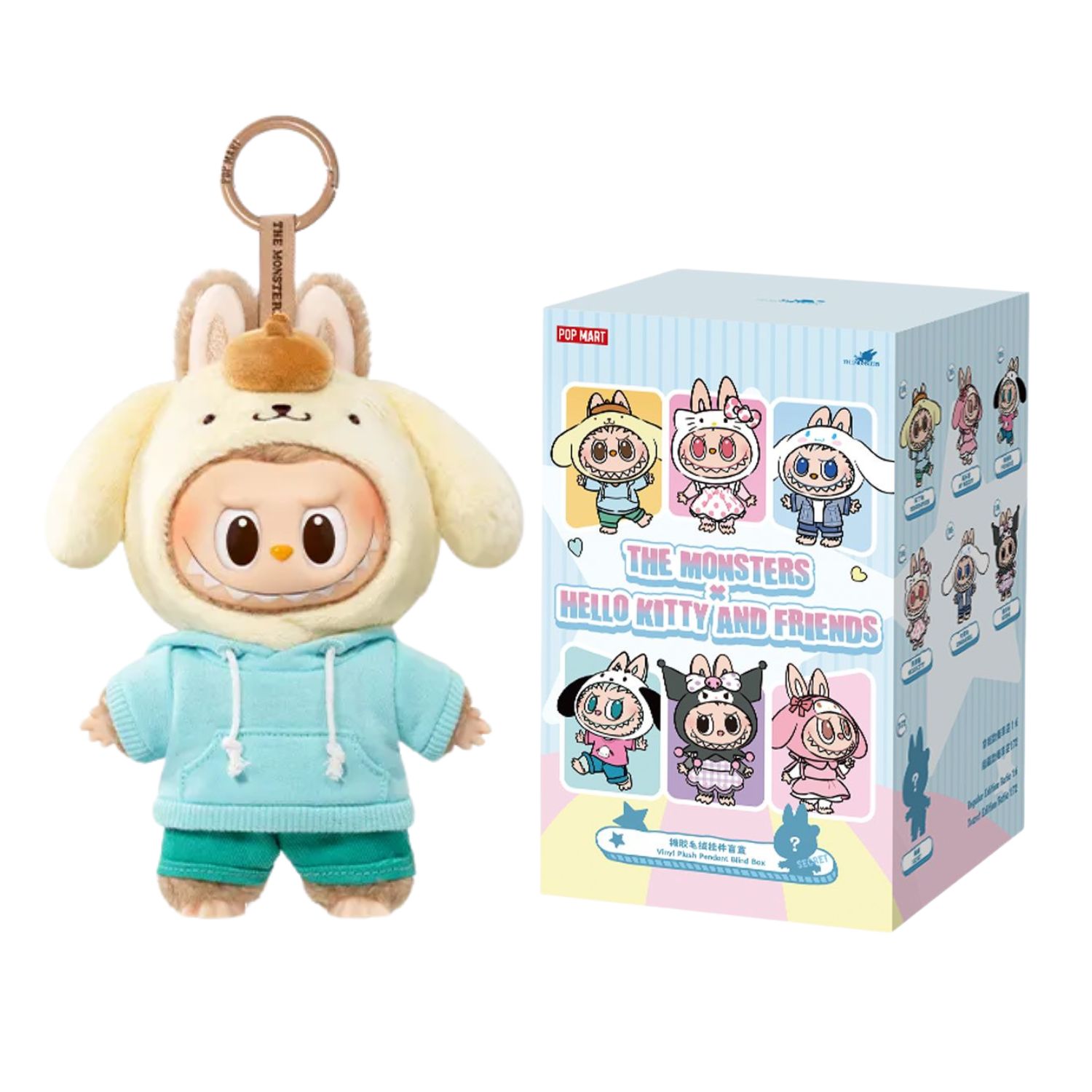 Pompompurin arrives dressed in a pastel blue hoodie and matching shorts, blending Sanrio’s beloved golden retriever warmth with Labubu’s iconic wide-eyed monster charm. The result is a collector-grade vinyl plush pendant that is equal parts cosy and unmissable.